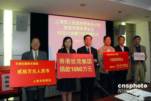 5月14日上午,上海僑商僑界企業(yè)向汶川地震災(zāi)區(qū)捐款一千萬余元。其中,上海市僑商會(huì)會(huì)長(zhǎng)、世茂集團(tuán)董事長(zhǎng)許榮茂先生以世茂集團(tuán)名義向?yàn)?zāi)區(qū)抗震救災(zāi)捐款1000萬元幫助災(zāi)區(qū)人民度過難關(guān)。在上海僑辦舉行的接受僑商僑界企業(yè)向?yàn)?zāi)區(qū)捐贈(zèng)儀式上,僑辦領(lǐng)導(dǎo)以及機(jī)關(guān)全體工作人員也向?yàn)?zāi)區(qū)紛紛捐款。中新社發(fā) 王江紅 攝