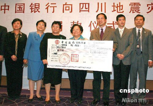 5月14日,中國銀行在北京舉行捐贈儀式,向中國紅十字總會捐款1000萬元人民幣,用于汶川地震災(zāi)區(qū)援救工作。中國紅十字總會會長彭佩云代表協(xié)會接受捐款。至此,中國銀行集團已向災(zāi)區(qū)捐款近2300萬元人民幣,是目前對此次抗震救災(zāi)捐款數(shù)額最大的企業(yè)。中新社發(fā) 廖文靜 攝