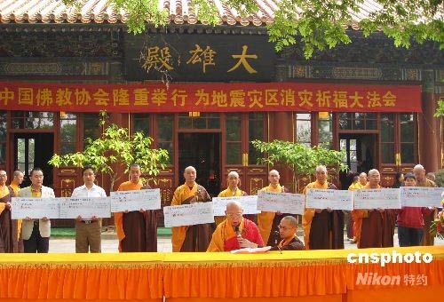 四川省汶川縣發(fā)生七點(diǎn)八級(jí)地震后,中國佛教協(xié)會(huì)十四日上午在北京廣濟(jì)寺隆重舉行消災(zāi)祈福大法會(huì)。現(xiàn)場賑災(zāi)捐款絡(luò)繹不絕,十一世班禪大師捐款十萬元人民幣。中新社發(fā) 徐長安 攝
