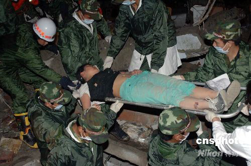 5月14日晨,在四川地震重災區(qū)的北川,武警官兵正奮力搜救北川中學的被困學生。中新社發(fā) 鄒憲 攝