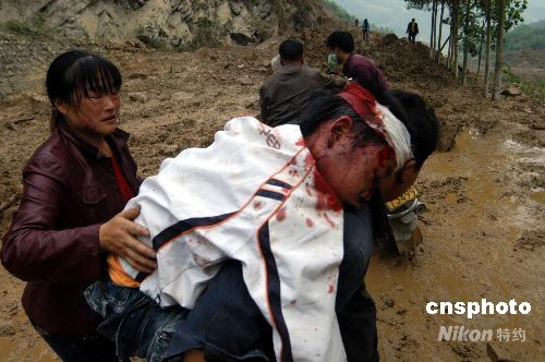 5月12日下午,四川綿陽平武縣平通鎮(zhèn)牛飛村五年級小學(xué)生楊豪在村民組織的自救中被救出。圖為當?shù)卮迕癖持鴹詈赖?公里外的村里找醫(yī)生救治。中新社發(fā) 成和平 攝