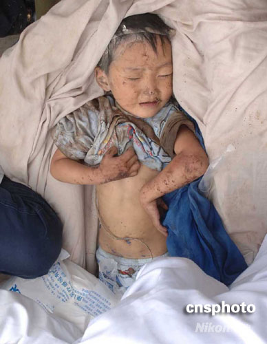 5月14日,四川省北川縣一名從廢墟中救出的兒童被安置在臨時搭建的醫(yī)療點內(nèi),接受簡單治療后被送往臨近的大城市。北川縣是“5.12”四川大地震中受災(zāi)最嚴(yán)重的地區(qū)之一。中新社發(fā) 鄒憲 攝