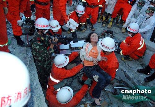 5月14日,重慶消防抗震救災(zāi)突擊隊(duì)官兵成功救出一名幸存者。13日晚19時30分,重慶消防抗震救災(zāi)突擊隊(duì)首批力量200名官兵歷經(jīng)12小時的長途奔襲,順利抵達(dá)北川中學(xué),并全面展開救援。截至14日下午19時,重慶消防抗震救災(zāi)突擊隊(duì)首批力量已成功從廢墟中救出22條生命。中新社發(fā) 萬明 攝