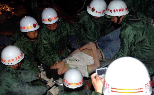 四川汶川縣5月12日發(fā)生7.8級(jí)地震后,北川縣北川中學(xué)受到極大的迫害,將近三千名的學(xué)生中僅有一半生存,另一部分學(xué)生因樓房倒塌而遇難或受傷。圖為抗震消防隊(duì)員不顧艱險(xiǎn)連續(xù)工作,利用不同工具挖掘被壓人員,并及時(shí)成功搶救出一批學(xué)員。中新社發(fā) 鄒憲 攝
