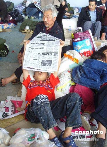 5月15日上午,來自北川地震災(zāi)區(qū)的群眾生活穩(wěn)定,一位小學生在綿陽市最大的抗震救災(zāi)救助點九州體育館內(nèi)認真讀報,了解災(zāi)情。中新社發(fā) 霍潺 攝