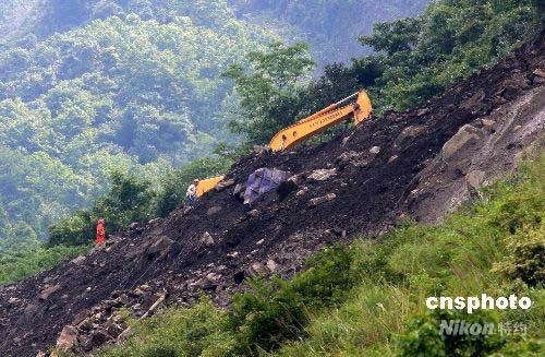 5月14日,四川都江堰紫平鋪水庫附近213國道,搶險隊伍用機器清除塌方山石。由于213國道數(shù)十處嚴重塌方,從都江堰到映秀、汶川的唯一道路被堵塞難以疏通,對災區(qū)的物資救援較為艱難。中新社發(fā) 周青先 攝