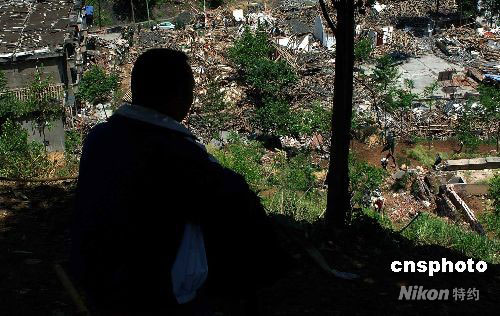 圖:一名北川縣城幸存者在地震廢墟前欲哭無(wú)淚
