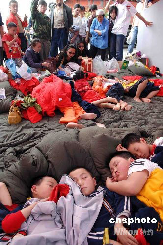 5月15日,從四川綿陽北川羌族自治縣等災(zāi)區(qū)救出的地震災(zāi)民被安置在成都九洲體育館救助站救助,高峰期該救助站曾有三萬余名災(zāi)民聚集。中新社發(fā) 陳文 攝