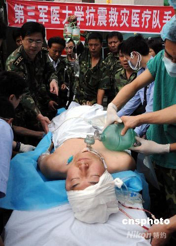 5月15日,解放軍第三軍醫(yī)大學(xué)“抗震救災(zāi)醫(yī)療隊(duì)”在四川地震災(zāi)區(qū)使用野戰(zhàn)手術(shù)車(chē)對(duì)受傷災(zāi)民進(jìn)行救治。據(jù)了解,這種野戰(zhàn)手術(shù)車(chē)可同時(shí)進(jìn)行兩臺(tái)手術(shù),車(chē)體內(nèi)配有呼吸機(jī)、麻醉機(jī)、心電監(jiān)護(hù)儀、多功能電切刀和空調(diào)等設(shè)備,為救治更多的傷員提供了保障。目前,該醫(yī)療隊(duì)已完成包括16例重癥顱腦損傷在內(nèi)的各類(lèi)手術(shù)近200例。圖為一名受傷災(zāi)民成功接受手術(shù)后被送出野戰(zhàn)手術(shù)車(chē)。中新社發(fā) 范忠武 攝