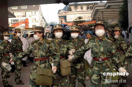 2008年5月15日,四川汶川7.8級地震災區(qū)都江堰市危樓排險工作在進行中。圖為江堰市一抗震搶險區(qū)大門前,武警女兵對救災現(xiàn)場進行保衛(wèi)工作。中新社發(fā) 鄒憲 攝