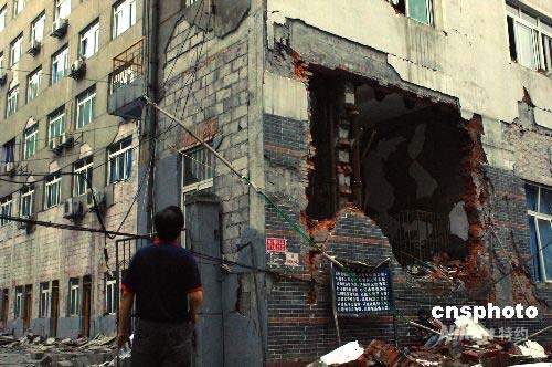 2008年5月15日,在地震災(zāi)區(qū)四川都江堰市,危樓排險(xiǎn)工作在進(jìn)行中。汶川7.8級(jí)地震,給都江堰市帶來巨大破壞,市區(qū)大批居民樓成危樓。目前危樓的居民疏散安置工作已初步展開,取得階段性成果。中新社發(fā) 鄒憲 攝