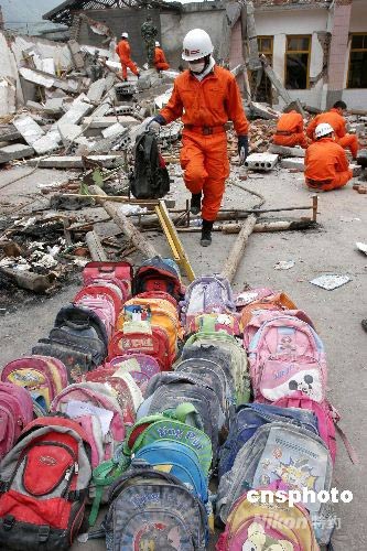 5月15日,在四川省什邡市紅白鎮(zhèn)中心小學廢墟旁,河南省消防總隊抗震救災突擊隊的搜救人員將找到的孩子們的書包整齊排放,等待家長認領,以告慰生者。五顏六色的小書包仿佛一個個鮮活的幼小生命立于記者的眼前。 中新社發(fā) 張曉理 攝