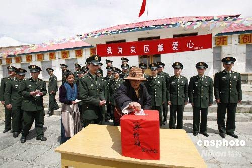 5月16日,駐守在海拔4500多米的青藏兵站部某大站黑河兵站官兵拿出津貼向四川災(zāi)區(qū)民眾獻(xiàn)上一份愛心。兵站的藏族職工索朗嘎姆、加里等也加入了捐款行列。中新社發(fā) 鄒小慶 攝