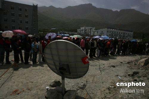 圖:茂縣開通首臺(tái)衛(wèi)星電話千人排隊(duì)等候