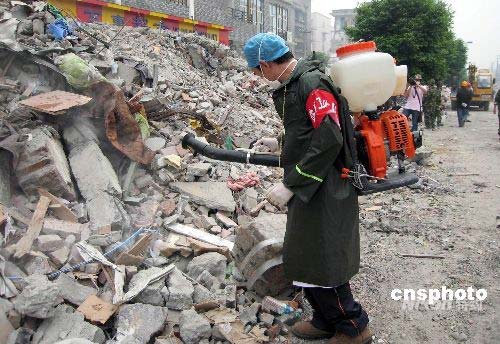 五月十七日,是汶川地震發(fā)生時間第六天,地震災區(qū)都江堰市最大的市場荷花池市場已開始用大型挖掘機、裝載機清理倒塌的樓房和廢墟,并有專業(yè)人員進行防疫消毒。中新社發(fā) 周丹鈺 攝