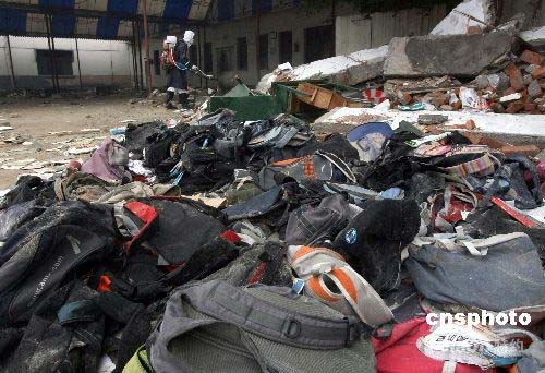 五月十七日,在汶川大地震中垮塌的灌縣聚源中學廢墟奪取了五十多位師生的寶貴生命,疾病控制人員今天開始對殘留的學生書包噴灑消毒藥。中新社發(fā) 賈國榮 攝