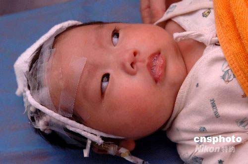2008年5月17日下午,四川大學華西醫(yī)院抗震救災急診部門,接來一位出生剛80天,來自地震重災區(qū)四川綿竹的女嬰,她的名字叫廖靜萱。廖靜萱目前腦部出現(xiàn)腦水腫,可能將要進行腦部手術(shù),其右腿也帶有地震創(chuàng)傷。中新社發(fā) 鄒憲 攝