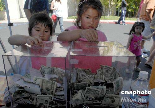 圖:洛杉磯華人小姐妹向四川災(zāi)區(qū)捐錢