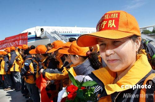 5月18日下午,由新疆多家醫(yī)療機構(gòu)醫(yī)護專家組成首批抗震救災(zāi)醫(yī)療防病救援隊從新疆烏魯木齊國際機場乘專機前往四川汶川地震災(zāi)區(qū)實施醫(yī)療救助和疫情防御工作,同時30噸救援所需的藥品和物資也隨救援隊一同被運往地震災(zāi)區(qū)。據(jù)了解,新疆首批抗震救災(zāi)醫(yī)療防病救援隊共計90人,由維、漢、哈、回等各族醫(yī)護工作者組成,其中女性24名。當日上午7輛救援工作車已從烏魯木齊出發(fā),趕向四川災(zāi)區(qū),預(yù)計54小時即可到達災(zāi)區(qū)。中新社發(fā) 劉新 攝