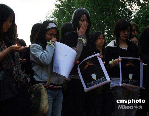 當?shù)貢r間18日晚,數(shù)百名留英中國學生和學者聚集到倫敦大學亞非學院,在燭光中為四川地震災區(qū)的人民祈禱與祝福。圖為悼念死難者時,手捧蠟燭的留學生們潸然淚下。中新社發(fā) 李鵬 攝