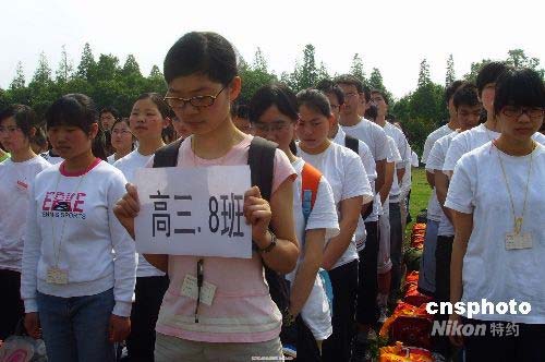 5月19日上午10點,在北川中學(xué)高三學(xué)生復(fù)課儀式上,同學(xué)們默哀悼念故者。中新社發(fā) 霍潺 攝