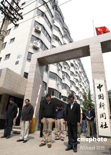 5月19日,中國首個全國哀悼日,14點28分,北京全城響起警報聲,中國新聞社總社全體值班員工在社領導率領下,在該社大門口列隊為四川汶川大地震中遇難同胞默哀三分鐘。中新社發(fā) 任海霞 攝