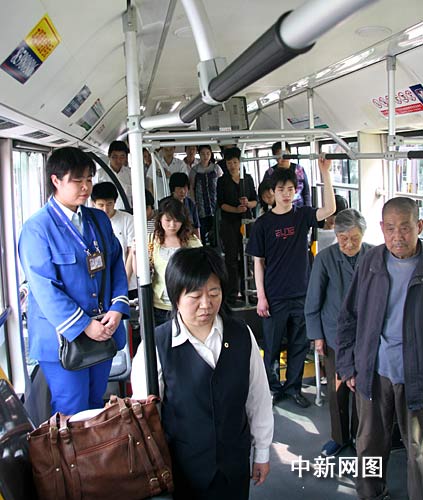 5月19日14時28分,正在運(yùn)營中的北京九路公交汽車停車鳴笛,車上乘客全體起立默哀,對四川汶川大地震遇難同胞表達(dá)深切哀悼。中新社發(fā) 甄雪原攝