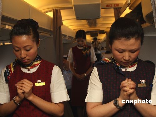 5月19日,中國首個(gè)全國哀悼日。下午14點(diǎn)28分,在北京飛往成都的CA4102航班上,空中小姐為地震遇難的同胞默哀。中新社發(fā) 趙振清 攝