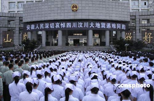 5月19日14點(diǎn)28分,安徽省在黃山市政務(wù)廣場(chǎng)舉行默哀儀式。安徽省委書(shū)記王金山、省長(zhǎng)王三運(yùn)等政府官員與三千余民眾集體為四川地震災(zāi)區(qū)死難同胞默哀3分鐘。中新社發(fā) 張婭子 攝
