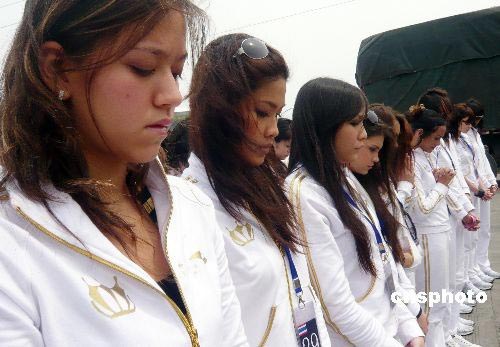 5月19日14時28分,為表達中國各族人民對四川汶川大地震遇難同胞的深切哀悼,中國國務院決定,2008年5月19日至21日為全國哀悼日。圖為正在中國廣西參加2008亞洲超級模特大賽的各國選手向四川汶川大地震遇難者默哀。中新社發(fā) 錢興強 攝