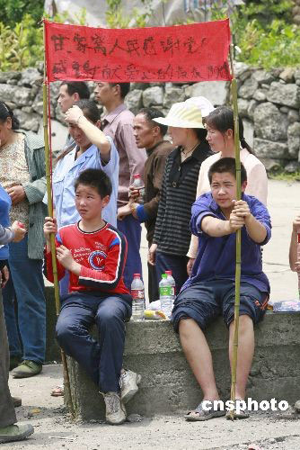 5月19日下午,四川省什邡市紅白鎮(zhèn)從深山里逃出來的兩名兒童在路旁手舉標(biāo)語,感謝救助他們的好人。