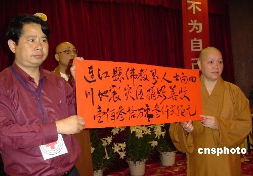 五月二十日上午,由福建省連江縣佛教協(xié)會(huì)主辦的“向四川地震災(zāi)區(qū)捐款的愛心募捐活動(dòng)”,在連江縣城舉行,三千余名連江縣佛教四眾弟子踴躍捐款獻(xiàn)愛心,共募集捐款一百三十多萬元人民幣。圖為連江縣佛教協(xié)會(huì)會(huì)長界渡法師,將一百三十多萬元善款轉(zhuǎn)交連江縣紅十字會(huì)匯往四川災(zāi)區(qū)。