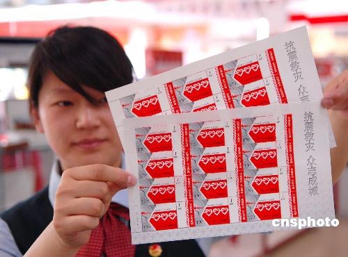 2008年5月20日,濟南市郵政局趵突泉郵電支局員工展示《抗震救災(zāi) 眾志成城》賑災(zāi)郵票。為進一步向地震災(zāi)區(qū)提供社會援助,當(dāng)日,中國郵政特別發(fā)行《抗震救災(zāi) 眾志成城》賑災(zāi)附捐郵票一套一枚,售價2.20元,其中郵票面值1.20元,附捐金額1元。該套郵票采用主、附票形式,畫面表現(xiàn)了全國各族人民在嚴重的地震災(zāi)害面前手拉手、心連心,眾志成城的堅定意志和無私奉獻精神。據(jù)了解,為了表達全體郵政員工對地震災(zāi)區(qū)人民的情誼,中國郵政集團公司決定將此套郵票的全部郵資收入1560萬元和附捐款1300萬元,共計2860萬元通過民政部門捐贈地震災(zāi)區(qū)。中新社發(fā) 崔鵬森 攝