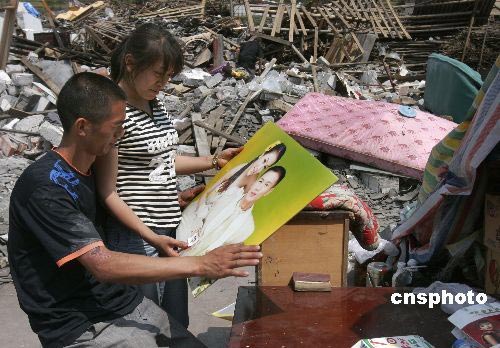 5月19日,四川省什邡市鎣華鎮(zhèn)仁和村三組梁正彬一家正在從廢墟中扒尋自家物品。他們很幸運(yùn),災(zāi)難發(fā)生時(shí),包括老父母和年幼女兒在內(nèi)的全家5口人都跑出了轟然倒塌的房屋!捌桨簿褪歉!”他們默默收拾殘屋,準(zhǔn)備重建家園。中新社發(fā) 張曉理 攝