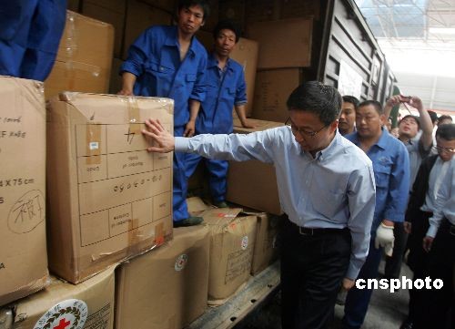 5月20日,上海市市長韓正親臨火車站指揮調(diào)運物資赴川救災(zāi)。截止到19日,上海連續(xù)緊急調(diào)集并運往災(zāi)區(qū)抗震救援物資達(dá)1127噸,價值2954.43萬元。中新社發(fā) 湯彥俊 攝