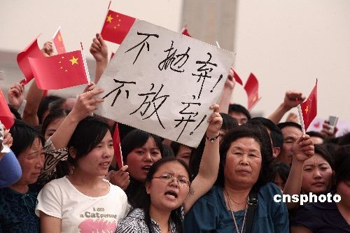2008年5月20日,全國哀悼日第二天,民眾在北京天安門廣場揮舞著國旗,為四川加油,希望災(zāi)民早日度過難關(guān)。中新社發(fā) 崔奉霞 攝