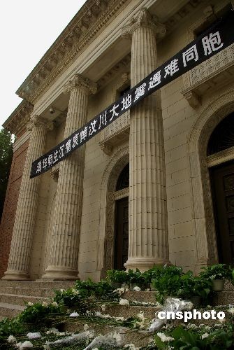 5月20日,清華大學(xué)大禮堂上方懸掛著黑底白字條幅:清華師生沉痛哀悼汶川大地震遇難同胞。全國哀悼日中,清華大學(xué)師生以各種方式表達對于遇難同胞的哀悼,以及對地震災(zāi)區(qū)同胞的關(guān)懷和支持。