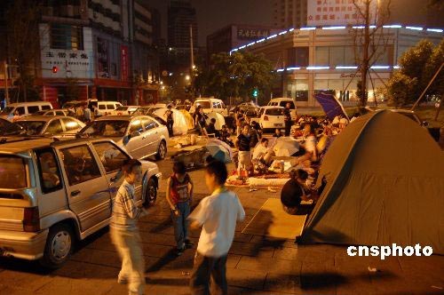 5月20日晚上,四川成都市民再次紛紛走出家門來到空曠地帶,或者睡在車上,或者在帳篷中,躲避余震。五月十九日晚間官方發(fā)布四川汶川大地震兩天內(nèi)可能發(fā)生六至七級(jí)余震的消息,當(dāng)晚成都市民紛紛在街頭避震。中新社發(fā) 劉萬強(qiáng) 攝