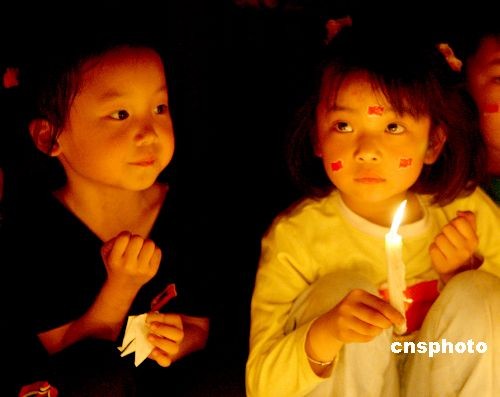 5月20日,安徽省淮北市網(wǎng)友的孩子在用燭光哀悼汶川大地震遇難者。當晚8時許,安徽省淮北市許多論壇網(wǎng)友自發(fā)帶著孩子聚集在淮北兩宮廣場,手持點燃的蠟燭,沉痛哀悼在地震中遇難的同胞,“加油中國、加油四川”的呼聲響徹現(xiàn)場。中新社發(fā) 王璋聞 攝
