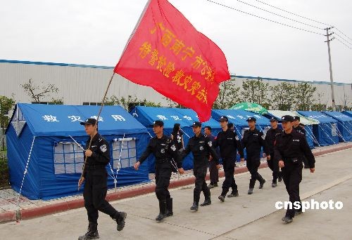 5月21日,支持四川地震重災(zāi)區(qū)的中國各地特警,主要任務(wù)從搶險救人轉(zhuǎn)為維護災(zāi)區(qū)社會秩序,圖為廣西南寧公安局特警搶險救災(zāi)突擊隊在重災(zāi)區(qū)都江堰市的受災(zāi)群眾安置點進行巡邏。中新社發(fā) 劉萬強 攝