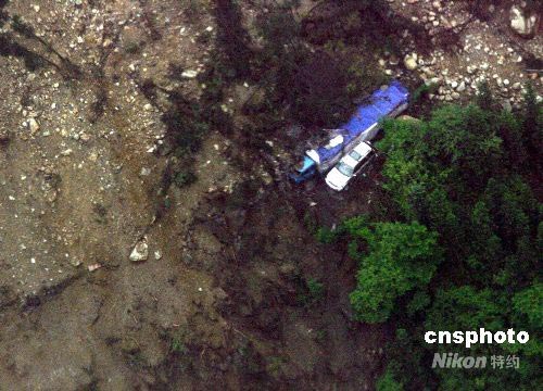 五月二十一日,在重災(zāi)區(qū)映秀鎮(zhèn)外圍上空隨處可見塌方公路上汽車遇險(xiǎn)時(shí)驚險(xiǎn)萬分的情景。中新社發(fā) 賈國榮 攝