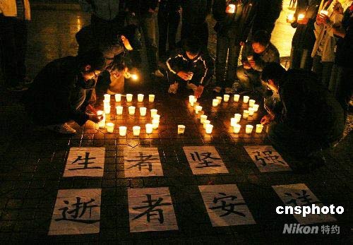 5月21日晚上,沈陽(yáng)市下起了大雨,但大雨沒(méi)有擋住市民哀悼的心情,大家自發(fā)的來(lái)到沈陽(yáng)市政府廣場(chǎng)用燭光等形式哀悼四川汶川地震遇難同胞并高呼“汶川加油,四川雄起,中國(guó)加油”等口號(hào)。中新社發(fā) 黃金昆 攝