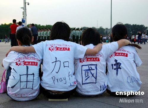 5月21日是全國(guó)哀悼日第三天,眾多群眾自發(fā)來(lái)到天安門(mén)廣場(chǎng)觀看降旗儀式。許多“80后”青年身穿印有“中國(guó)挺起”、“中國(guó)加油”的文化衫,手持白菊為汶川大地震遇難同胞做最后送別。中新社發(fā) 九州 攝