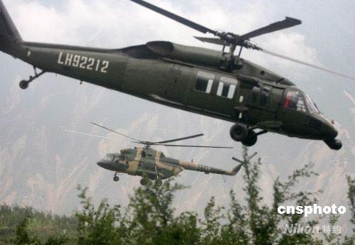 5月22日是汶川大地震的第十一天,成都軍區(qū)陸航團密集飛行,空降帳篷等救災(zāi)急需物資到受災(zāi)嚴(yán)重的高山羌寨。中新社發(fā) 賈國榮 攝