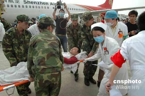 5月22日15時40分,深圳航空公司一架波音737飛機準時將38名四川災區(qū)傷員運抵南寧國際機場。大批早已集結(jié)在此的醫(yī)護人員迅速將傷員轉(zhuǎn)運至南寧各大醫(yī)院。當天將有4架飛機共144名傷員運至南寧,這些在地震中經(jīng)歷了生死瞬間的四川同胞,將分別被安排在廣西醫(yī)科大學第一附屬醫(yī)院等四個醫(yī)院進行后續(xù)治療。中新社發(fā) 蔣雪林 攝