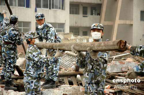 5月22日,正在四川地震災(zāi)區(qū)執(zhí)行救災(zāi)任務(wù)的海軍陸戰(zhàn)隊某旅兩棲偵察女兵隊的姑娘們走進什邡市師古鎮(zhèn)的村莊和村民住戶,幫助受災(zāi)民眾清理廢墟,重建家園。中新社發(fā) 李唐 攝