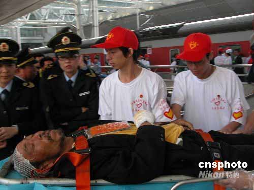 5月22上午,運(yùn)送著243名四川地震災(zāi)區(qū)傷員的云南愛(ài)心專列從江油抵達(dá)昆明火車(chē)站。圖為志愿者用擔(dān)架護(hù)送一位重傷病者上救護(hù)車(chē)。中新社發(fā) 保旭 攝