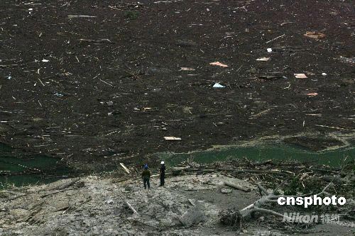 汶川大地震發(fā)生以后,水利地質(zhì)人員乘直升飛機(jī)降落到北川唐家山堰塞湖,檢測(cè)水位上漲和污染危情,嚴(yán)密監(jiān)測(cè)由于一座大山的崩塌堵塞河道形成的堰塞湖。中新社發(fā) 賈國(guó)榮 攝