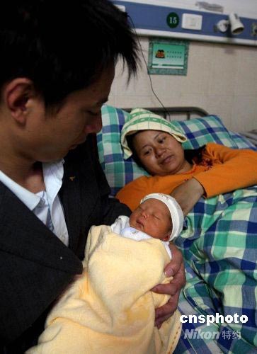 5月23日,李美川(右)和丈夫李應(yīng)剛在綿陽市第三人民醫(yī)院細心照顧小寶寶李虹升。5月17日,孕婦李美川被武警官兵從地震重災(zāi)區(qū)北川縣漩坪鎮(zhèn)護送出來后順利分娩,母子現(xiàn)在一切安好。中新社發(fā) 黃榮 攝