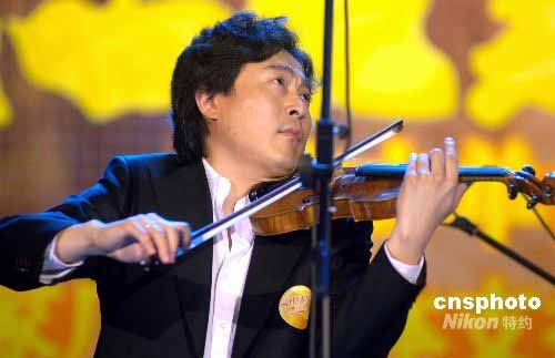 5月24日夜晚,北京民族文化宮大劇院隆重舉行《我們?cè)谝黄?#8212;—抗震救災(zāi)大型配樂(lè)詩(shī)文朗誦義演》。圖為著名旅美小提琴家呂思清,激情演奏《思鄉(xiāng)曲》。此晚會(huì)是由中國(guó)廣播藝術(shù)團(tuán)主辦、美中經(jīng)貿(mào)投資總商會(huì)會(huì)長(zhǎng)、世界著名品牌大會(huì)等單位協(xié)辦的,會(huì)上為中國(guó)紅十字會(huì)募集賑災(zāi)資金267.6萬(wàn)元人民幣。中新社發(fā) 鄒憲 攝
